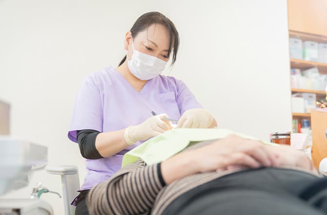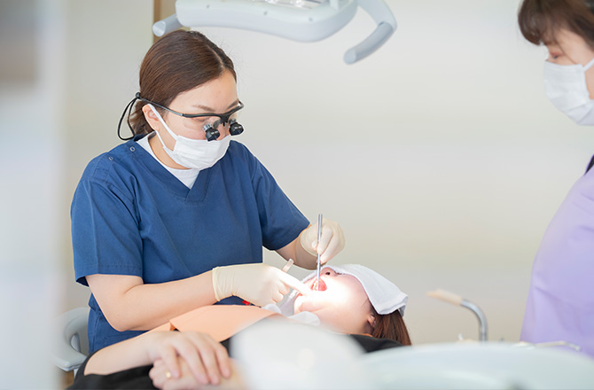 当院では、痛みに敏感な方や歯科治療が苦手な方にも安心して通っていただけるよう、できる限り痛みを抑えた治療を心がけています。麻酔の前には表面麻酔を使用し、注射時の痛みが軽くなるようにしています。さらに極細針を使用して、圧力や温度差による痛みを感じにくくしています。