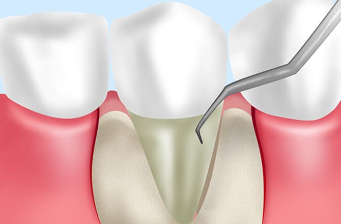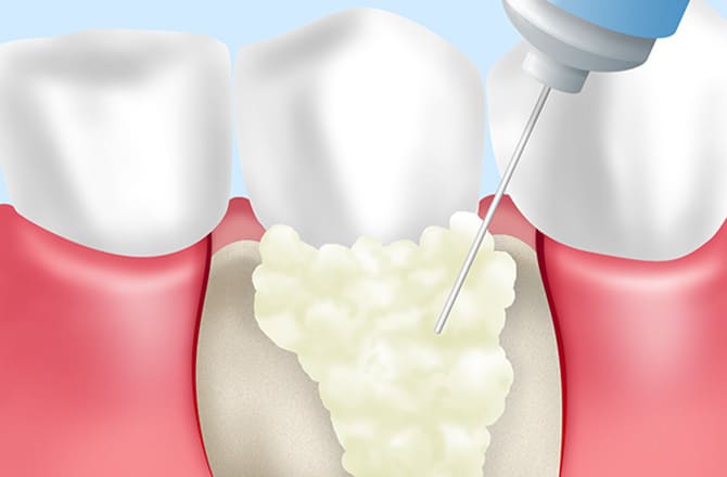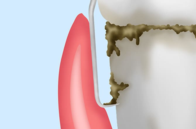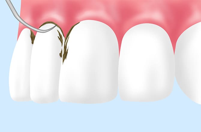 SRP(スケーリング&ルートプレーニング)では、麻酔をして歯肉に隠れた見えない部分の歯石などを除去します。除去後は、歯根の表面をつるつるに磨き上げて、汚れを付きにくくします。